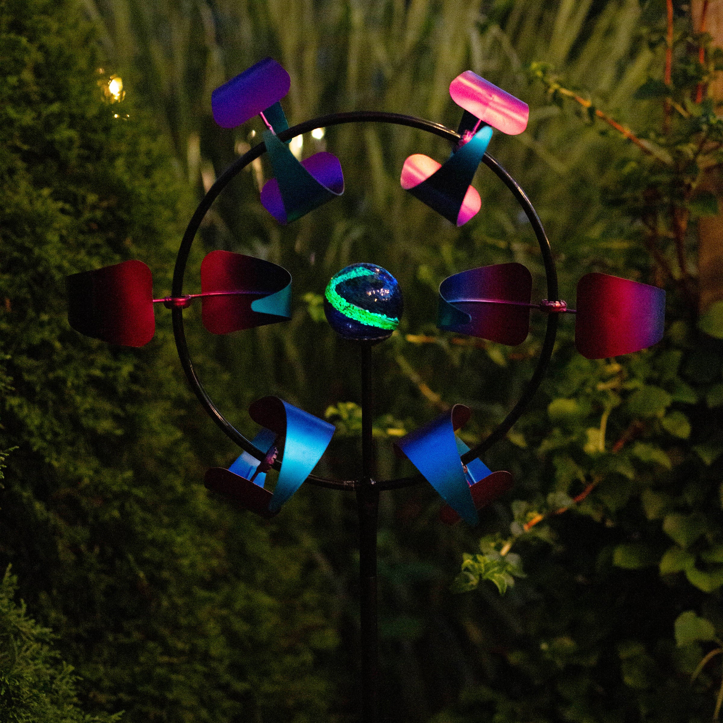 Enhance the natural beauty of any outdoor setting with the eye-catching colors and riveting multi-directional movement of our Halo Spinner Stakes. At 61" tall, they're the perfect focal point for any yard, flowerbed or garden and require no tools for assembly/disasembly. Available in three attractive colors.