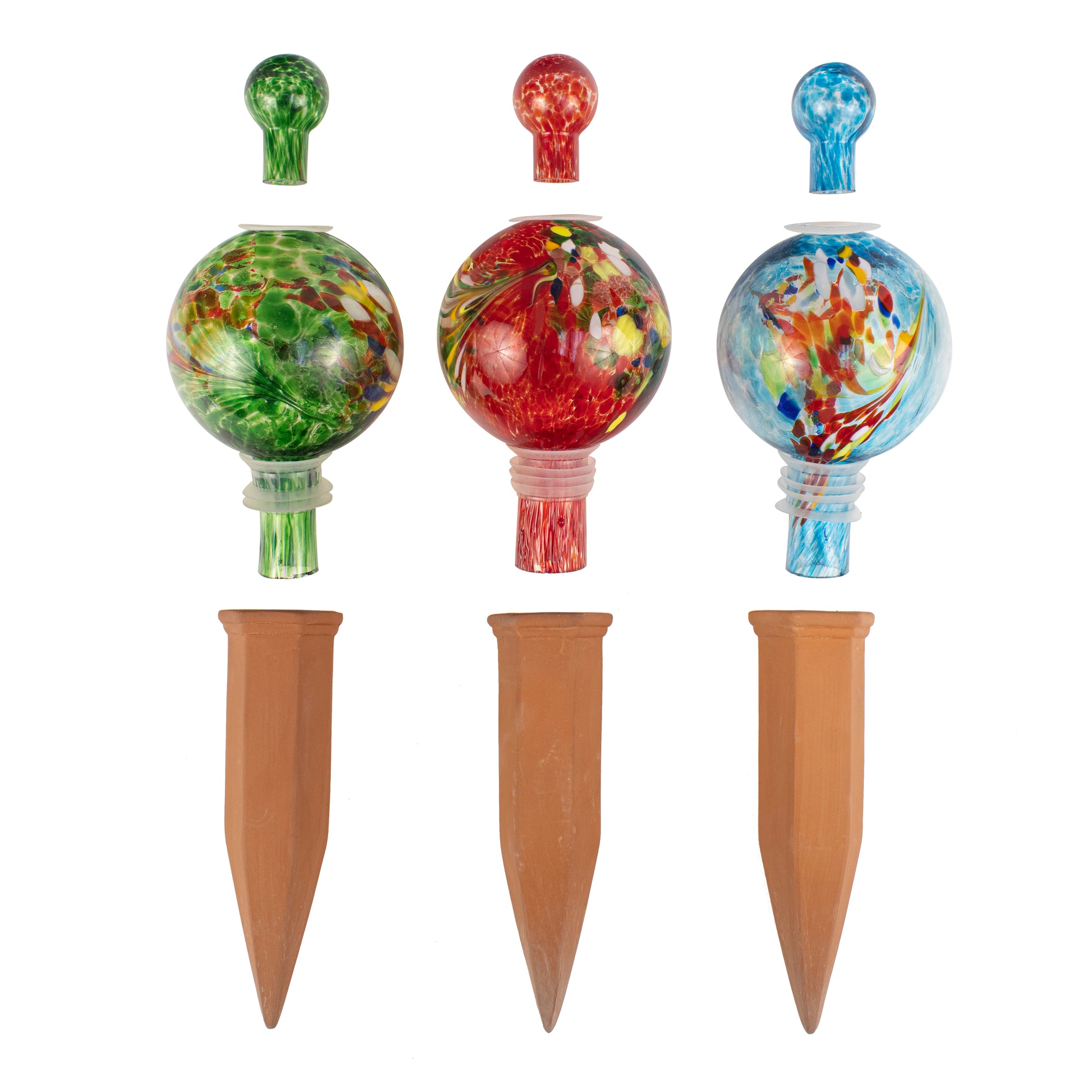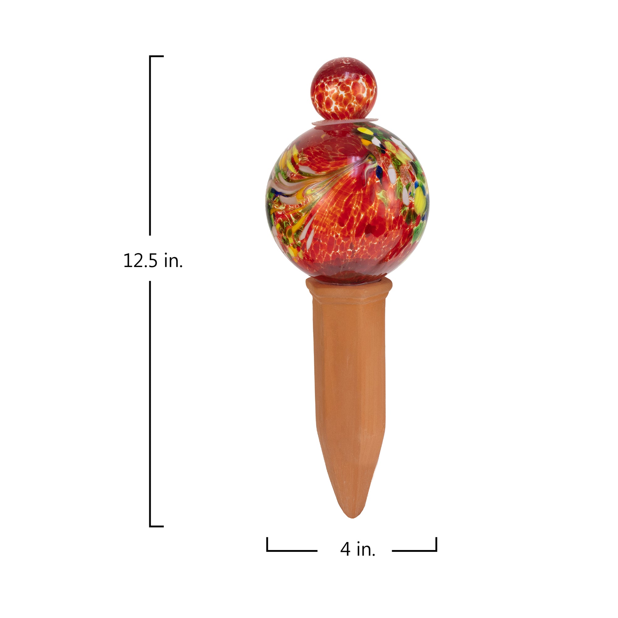 Keep interior house plants thriving and healthy all year-long the "no fuss, no muss" way with our "set it and forget it" Globe Plant Quenchers! The exquisite art glass reservoir and stopper are individually blown by hand ensuring that no two are alike. The durable terracotta spike the reservoir goes into is porous, allowing the root structure of the plant to wick water from it as needed - eliminating overwatering and underwatering. There's no better method to self-water plants, as not only do the work great and require little maintenance, but they look equally impressive accenting the pot, planter or container they are in. Fill when water is no longer present in the glass reservoir.